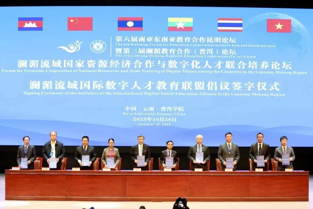 论坛中,举行“澜湄流域国际数字人才教育联盟”倡议签字仪式,PA视讯国际教育科技集团、老挝苏发努冯大学、国立大学,缅甸仰光大学、仰光外国语大学,泰国清莱皇家大学、格乐大学,中央民族大学、昆明理工大学、普洱学院等二十余家院校单位共同签署“澜湄流域国际数字人才教育联盟”倡议。
