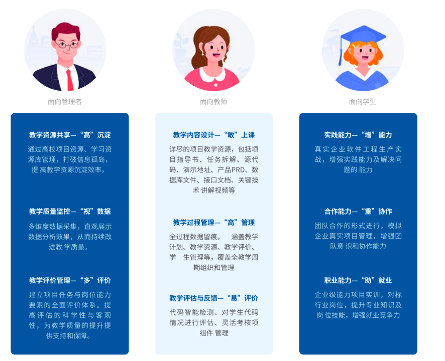 l 項目管理:真實軟體研發生產流程 覆蓋需求分析、系統設計、代碼實現、系統測試全階段,给予靈活透明、輕量高效的多模式看板,给予全流程任務追蹤,任務內容、進度一目了然。 l 代碼管理:基於GitLab的代碼管理 依據教學分組情況,智能為項目組創建代碼倉庫。支持多人協作開發,團隊成員可以共享、代碼并行開發。實時記錄和跟蹤代碼倉庫的變更情況,實時掌握代碼的演進過程。 l 持續集成與管理:自動化集成與部署 给予可視化、可配置的CI/CD持續交付軟體⽣產線,實現DevOps持續交付⾼效⾃動化。 支持一鍵自動化編譯構建及部署,過程⾃動化,內置10+構建標準、 20+種框架,減少了⼿動操作和⼈為錯誤的可能性,提⾼效率和可靠性,按需分配資源,⽀持單體、微服務的部署⽅式。 给予多個維度對代碼進⾏評價,從代碼風格、可讀性、可靠性、安全性、可維護性等⽅⾯; 將問題準確定位到具體的代碼⾏,使開發者迅速找到問題所在,加快問題修復速度; 針對代碼問題,给予相應的修改意見,幫助開發者改進代碼質量。 可視化教學情況,展⽰項⽬組任務和成員貢獻,幫助教師和管理者監控教學效果,及時發現問題並採取相應措施;可視化項⽬進度,展⽰任務完成情況等,幫助項⽬成員分析項⽬的整體進展情況,及時調整⼯作計劃和資源分配,確保項⽬按時完成。 以能力目標為導向,將碎片化的行業項目案例資源進行重構、顺利获得能力目標逐級分解形成清晰的能力點脈絡,顺利获得與項目案例任務進行有效關聯,從而實現能力圖譜建設。顺利获得分析學生在實訓過程中的表現、項目完成情況以及代碼質量等多維度數據,智能生成每個學生的能力圖譜,直觀展示學生的能力強弱和提升空間。產品特色