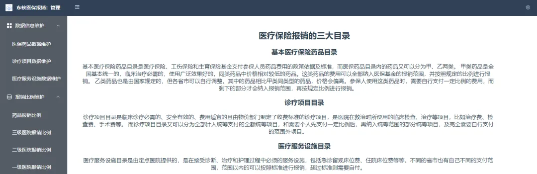该项目采用真实的业务流程和技术架构,使用前后端分离开发,业务涉及“医疗保险基本信息维护”、“医院住院医生站医嘱处理”、“医保中心报销管理”等三个核心模块。项目使用主流新技术进行项目开发:使用新版本Vue3+ElementPlus工程化开发前端,使用SpringBoot开发后端,完成前后端分离项目开发。