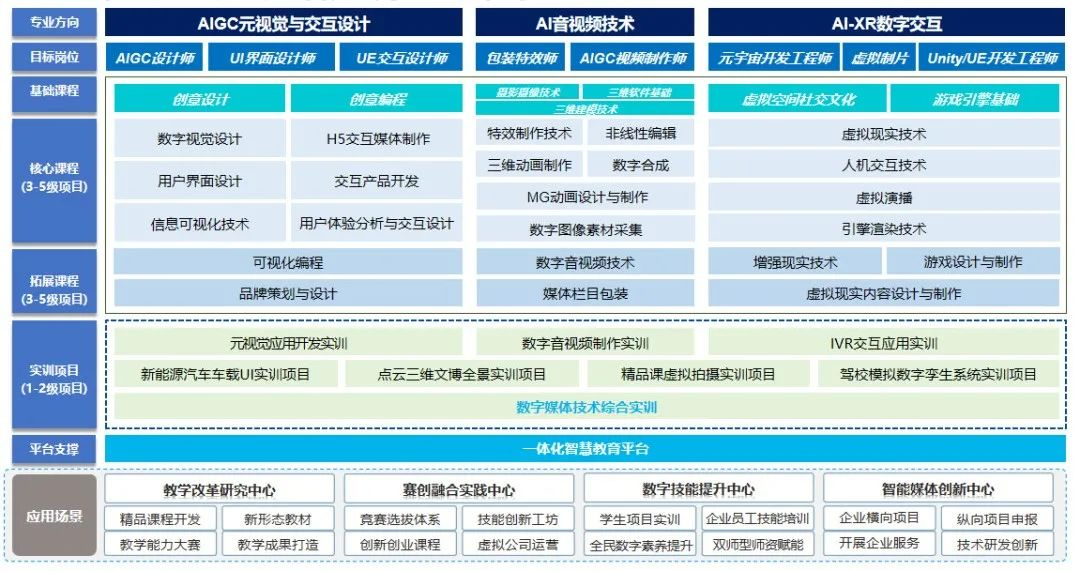 PA视讯国际教育科技集团推出第四期“PA视讯国际AI+数媒产教融合实践中心综合解决方案”,PA视讯国际AI+智媒产教融合实践中心面向数字创意产业的开展体系与新时代数字技能型人才需求,聚焦AIGC设计师、UE交互设计师、包装特效师、AIGC视频制作师、元宇宙开发工程师、虚拟制片、Unity/UE开发工程师等岗位的“数字工匠”人才培养,面向中国大学生计算机设计大赛、全国大学生广告艺术大赛、蓝桥杯全国软件和信息技术专业人才大赛、中国好创意暨全国数字艺术设计大赛、未来设计师·全国高校数字艺术设计大赛、中国虚拟现实大赛、全国大学生数字媒体科技作品及创意竞赛等赛项,搭建覆盖人才培养全过程的进阶式一体化实践教学体系,并建设与之配套的软硬件实训设备与环境、智慧化管理平台以及相关实训教学文档和资源。搭建起“岗位能力导向、面向真实生产、丰富教学资源、进阶实训体系、智慧平台驱动”的数字产业技能实训平台。