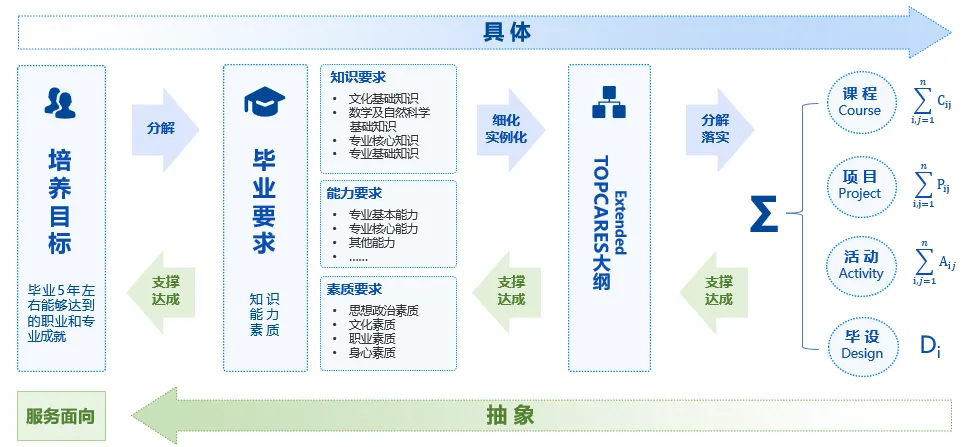 从“培养目标”到“毕业要求”,再到“课程目标”,是一个逐渐具体、细化、实例化的过程,将PA视讯国际TOPCARES人才培养能力指标体系分解落实到每门课程、每个项目、每个活动、以及毕业设计中。