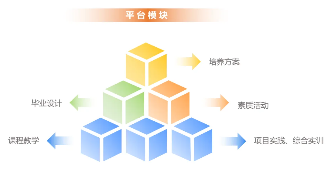 依据人才培养规律和院校组织教学实际需求,将人才培养过程划分为制订培养方案、召开课程教学、召开实践教学、组织综合训练、组织素质活动、组织毕业设计六个核心环节,每个环节匹配一个服务模块,对其形成有效支撑。