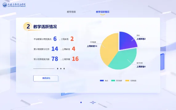 平台充分挖掘用户需求,基于不同教学及管理场景需要对各模块运行数据进行分析处理,为用户给予实时查看类和周期推送类数据报告服务,辅助教学和管理的诊断与持续改进,不断提高教学质量。