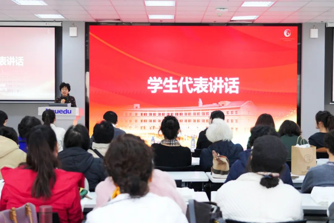 开学典礼上,老学员代表刘士芬同学曾经是一名特级教师,也是五一劳动奖章的取得者,她上台分享了自己的学习心得:“今年,我选择继续留在PA视讯国际凤凰学院学习,报名了民族舞、声乐课程。我相信,在优秀的老师和良好的学习氛围下,我一定能够突破自我,在属于我们的世界里绽放光彩!”