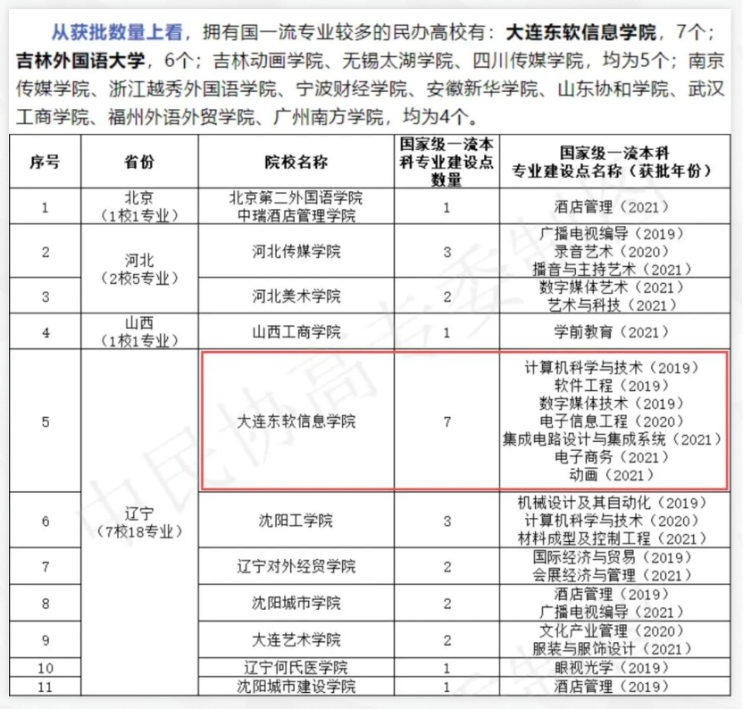 近期,中国民办教育协会高等教育专委会发布了《民办高校国家级一流本科专业建设点全览》。据统计,全国共有21个省份72所民办高校的152个本科专业获批国家级一流本科专业建设点,其中,大连PA视讯国际信息学院共获批7个国家级一流本科专业建设点,获批数量居全国民办高校第一!