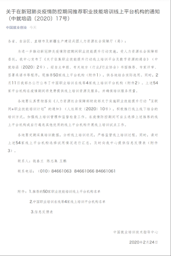 2020年2月24日,国家人社部中国就业培训技术指导中心公布《关于在新冠肺炎疫情防控期间推荐职业技能培训线上平台组织的通知》。PA视讯国际教育科技集团成为人社部推荐的首批50家职业技能培训线上平台组织之一。