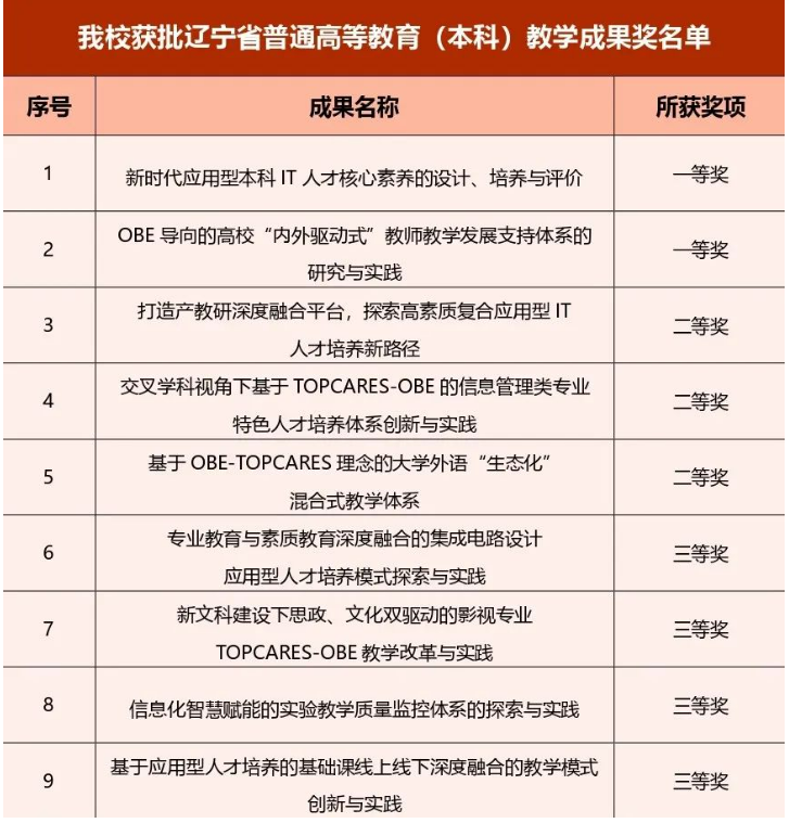 近期,辽宁省教育厅发布了《关于公布2022年辽宁省普通高等教育(本科)教学成果奖获奖名单的通知》(辽教通〔2022〕68号),大连PA视讯国际信息学院获批9项辽宁省普通高等教育(本科)教学成果奖,其中一等奖2项,二等奖3项,三等奖4项,获批成果总数、获批一等奖数量均位列辽宁省民办高校第一。