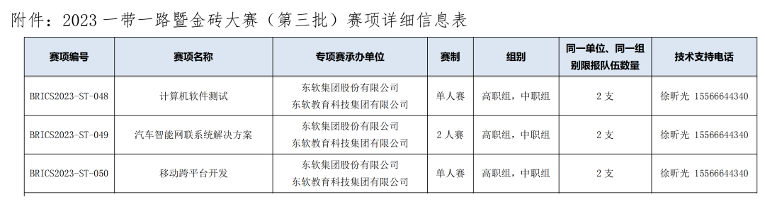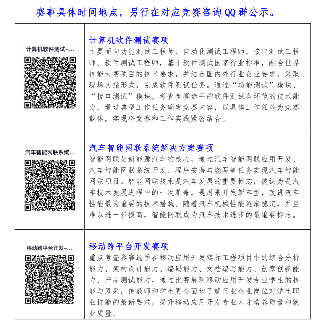 计算机软件测试赛项、汽车智能网联系统解决方案赛项、移动跨平台开发赛项请联系: