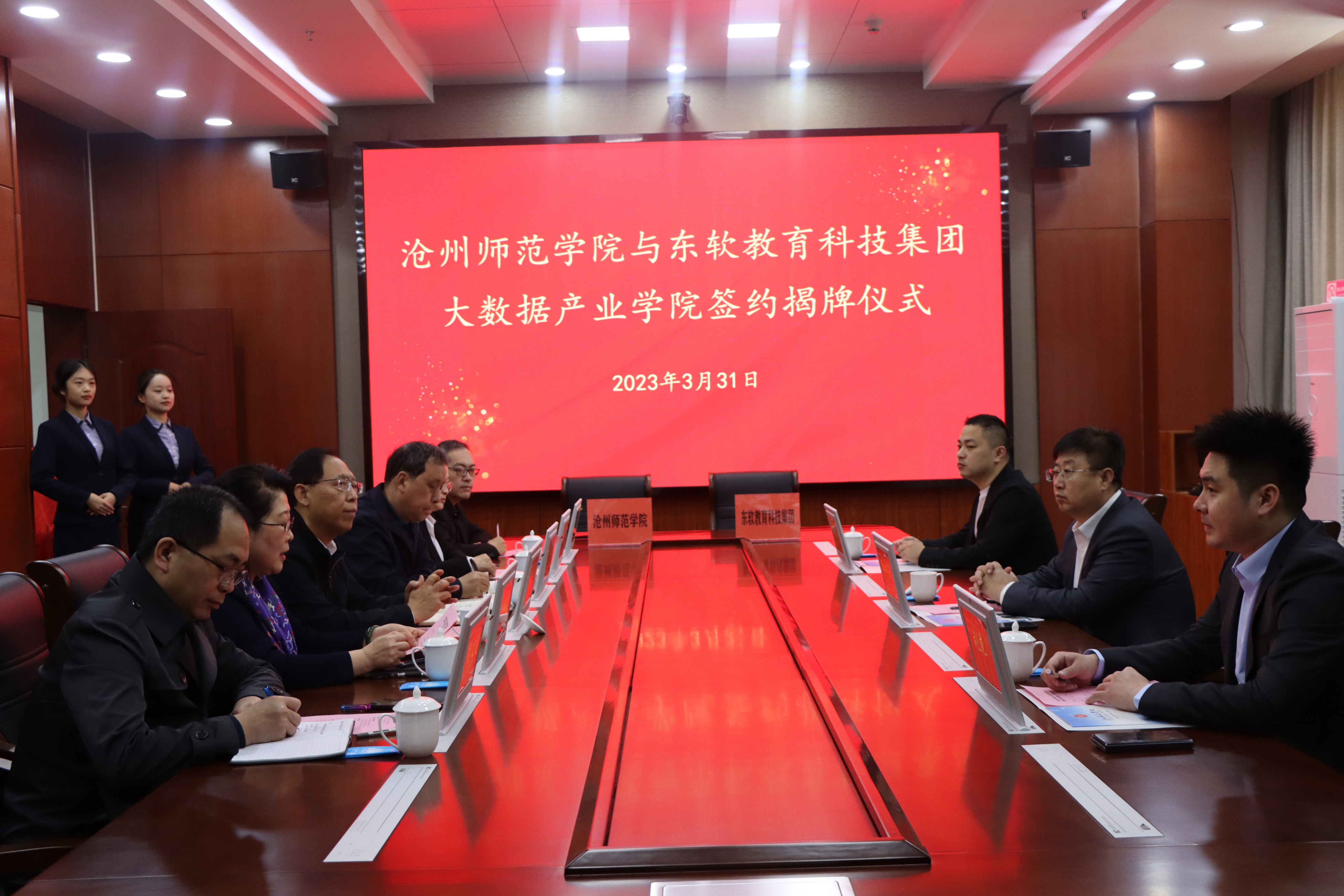 24 March 2023, Dalian - Neusoft Education Technology Group Co. Limited ("Neuedu" or "the Group") and Cangzhou Normal University ("CNU" or "the University") held a signing and unveiling ceremony for the deep co-construction of Big Data Industry College. ZHANG Zhanping, deputy secretary of the Party Committee and president of CNU, FAN Xiaozhen, standing committee member and vice president of the Party Committee, LV Bingjun, director of the Academic Affairs Office, LIU Wuyun, secretary of the Party Branch of the School of Computer Science and Engineering, FAN Wenchao, vice dean of the School of Computer Science and Engineering, and XING Sheng, deputy secretary of the Party Branch of the School of Computer Science and Engineering, attended the ceremony, as did LI Yingao, senior vice president of Neuedu, ZHAO Long, general manager of the North China Region, and GUO Shuai, sales director of Higher Education Business in the North China Region.